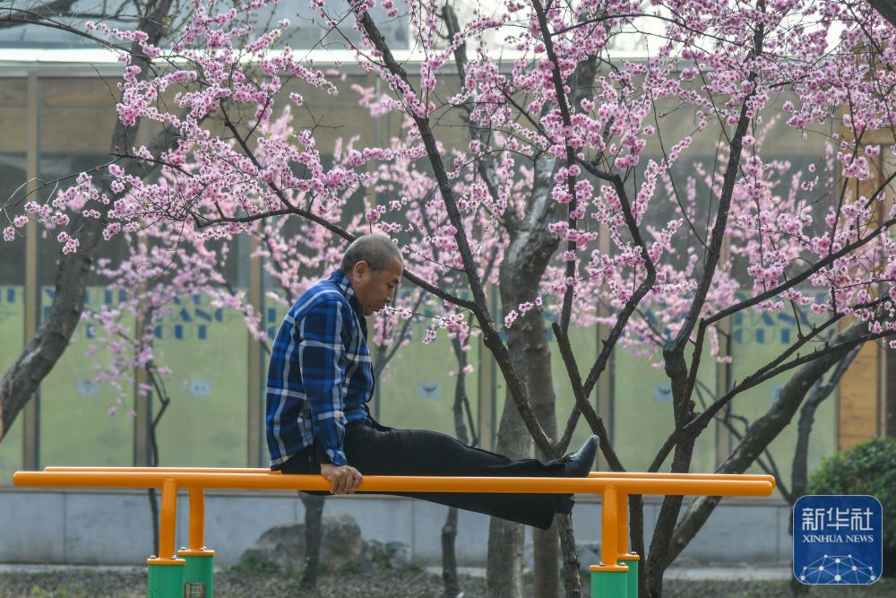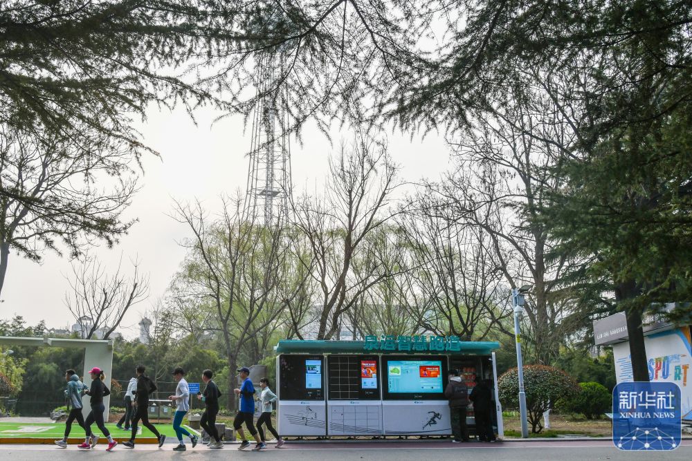 ↑ 济南泉城公园内,健身爱好者在全龄智能健身区锻炼(3月22日摄)。