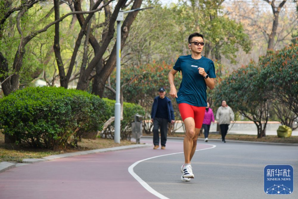 ↑ 济南泉城公园内,健身爱好者在健身步道跑步(3月22日摄)。新华社记者 朱峥 摄