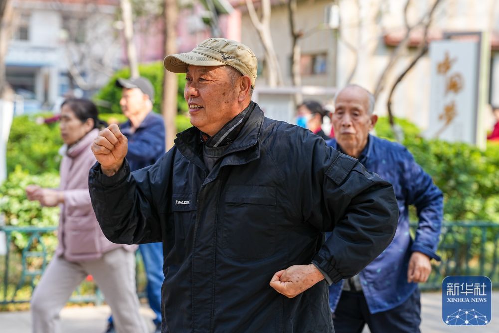 ↑ 济南市历下区佛山苑社区内,社会体育指导员王英仙(前)在指导爱好者练习太极拳(3月19日摄)。