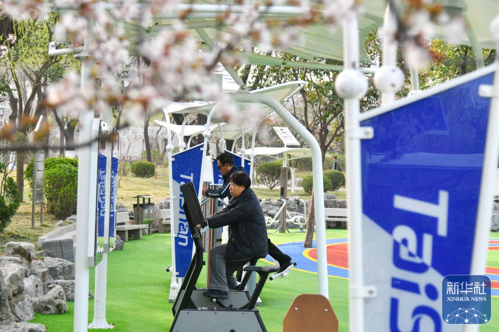 ↑ 济南市历下区燕子山中区社区内,居民在升级后的“口袋公园”内参加健身活动(3月19日摄)。