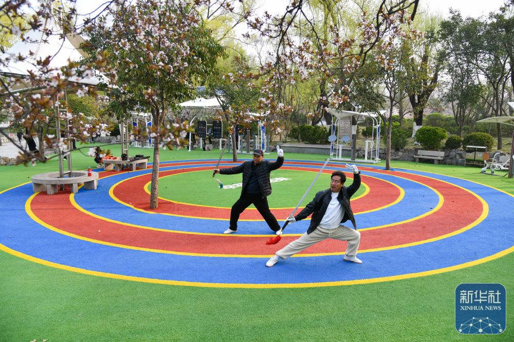 ↑ 济南泉城公园内,健身爱好者在全龄智能健身区练习太极剑(3月22日摄)。