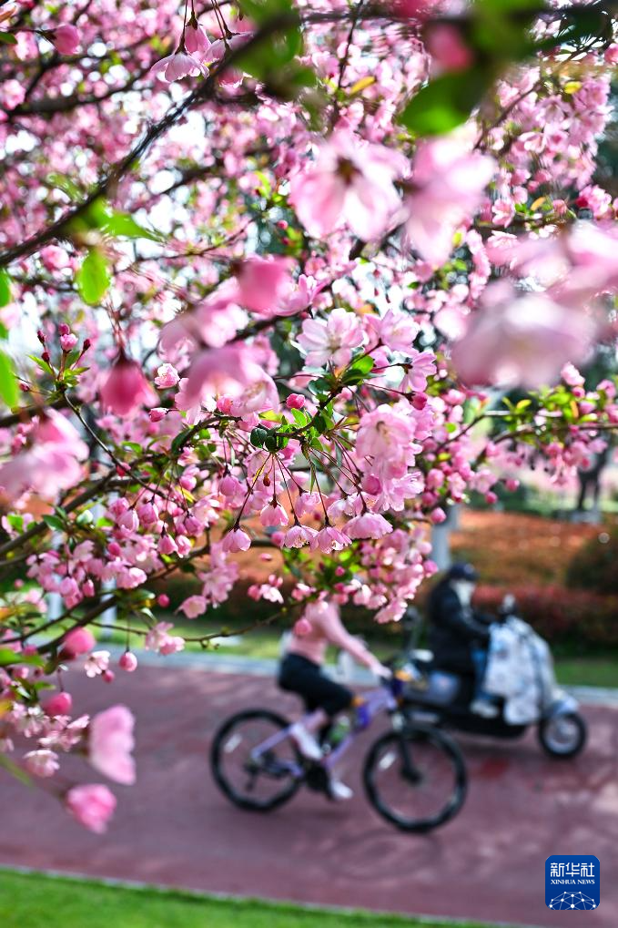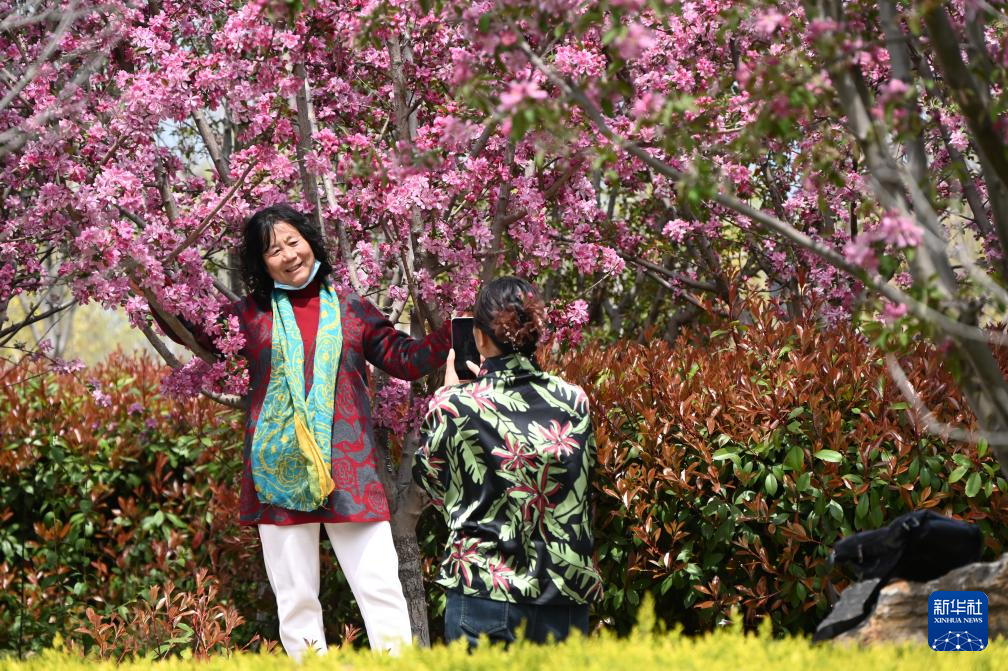 3月27日,游客在河南省南阳白河国家城市湿地公园观赏海棠。新华社发(高嵩 摄)