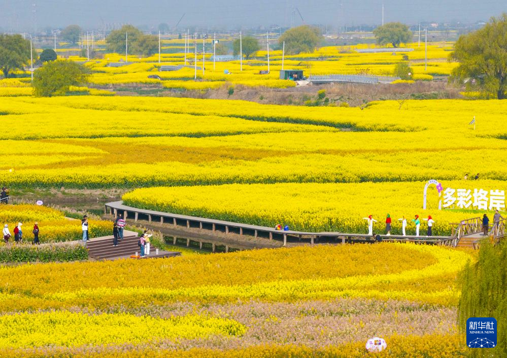 3月28日,游客在江苏泰州海陵区华港镇多彩垎岸景区赏花游玩(无人机照片)。新华社发(汤德宏 摄)