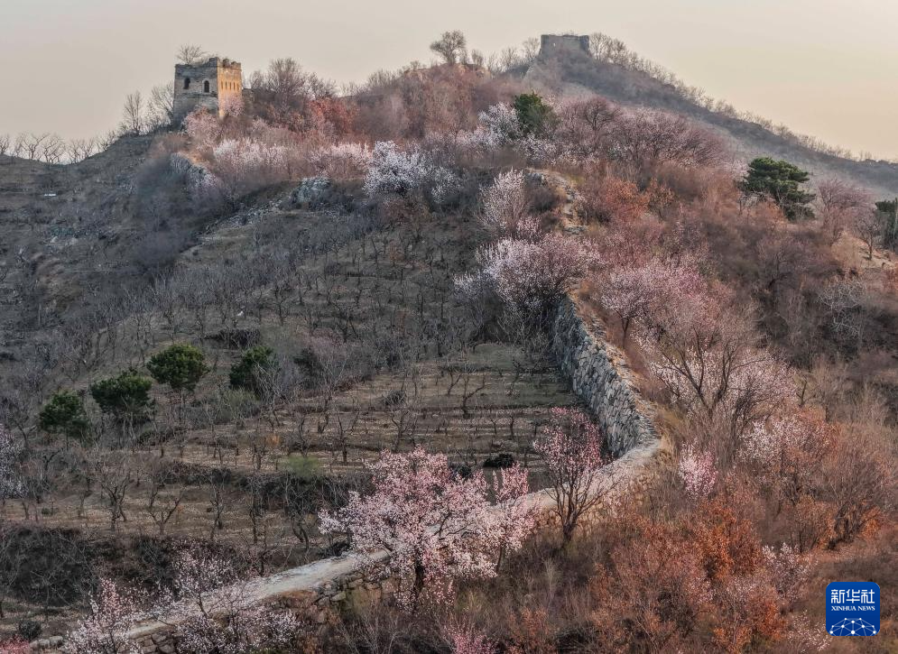 3月28日,河北省遵化市境内的古长城附近山花盛开(无人机照片)。新华社发(刘满仓 摄)