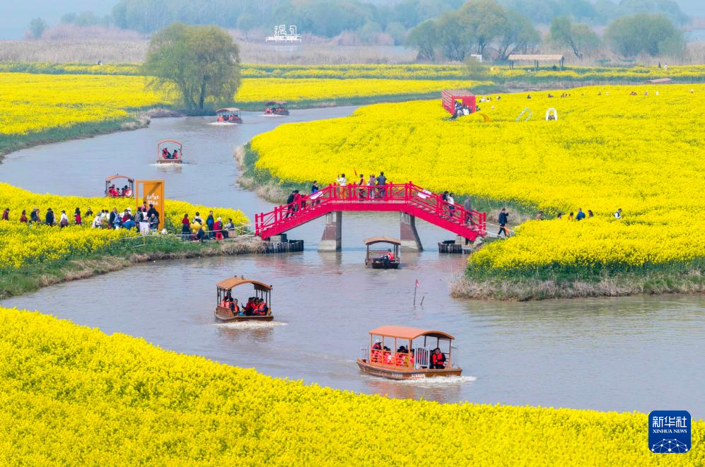 3月28日,游客在江苏省高邮市湖上花海景区赏花游玩(无人机照片)。新华社发(周社根 摄)
