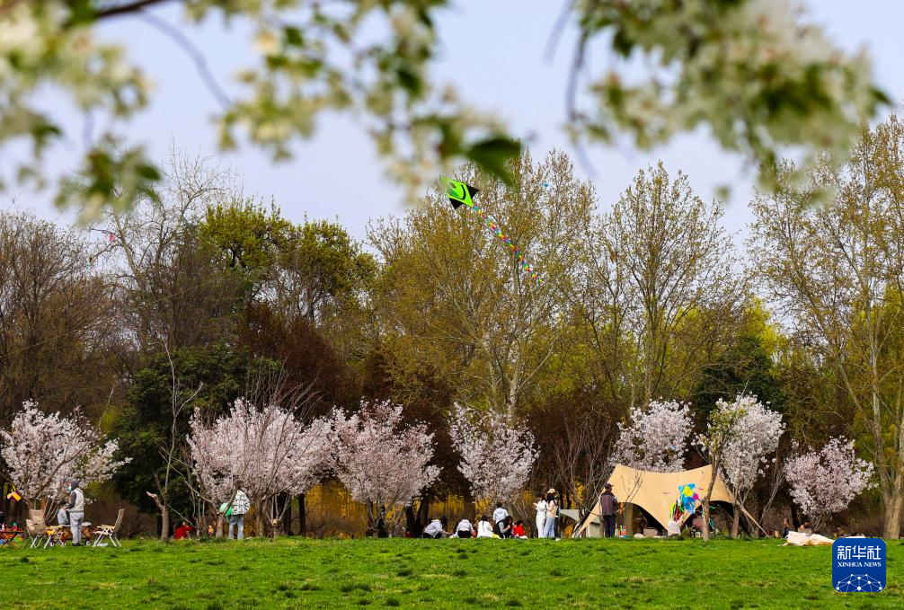 3月28日,人们在河南省开封市黑岗口调蓄水库赏花游玩。新华社发(李俊生 摄)