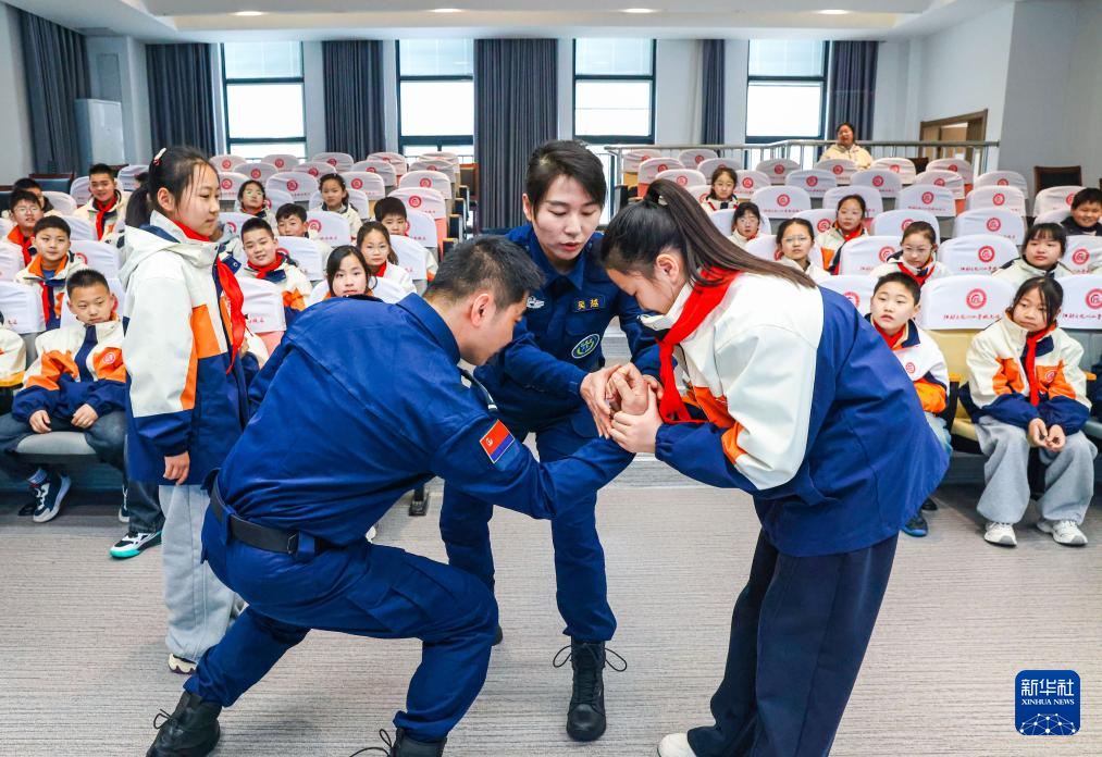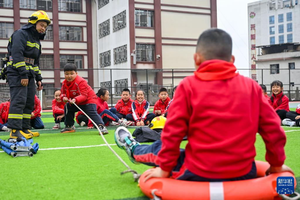 3月30日,消防员在贵州省开阳县第一小学指导学生演练溺水自救互救的基本技能。新华社发(袁福洪 摄)