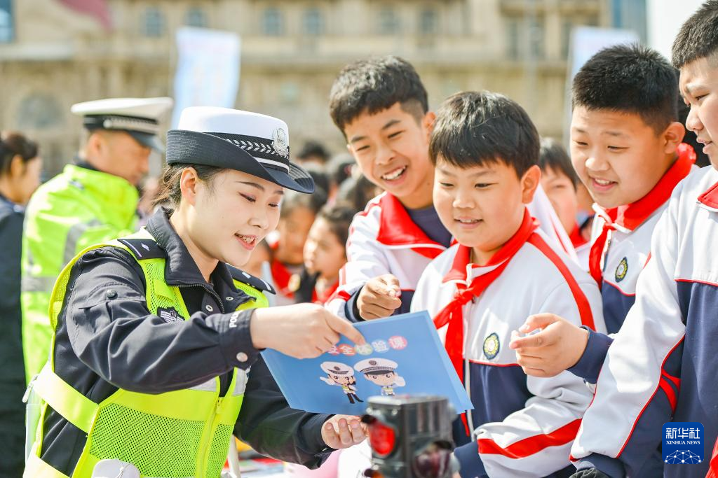 3月30日,在河北省石家庄市柏林庄学校开展的安全教育主题活动中,交警为小学生讲解交通安全知识。新华社发(陈其保 摄)