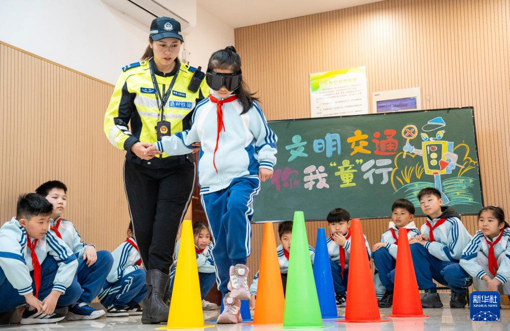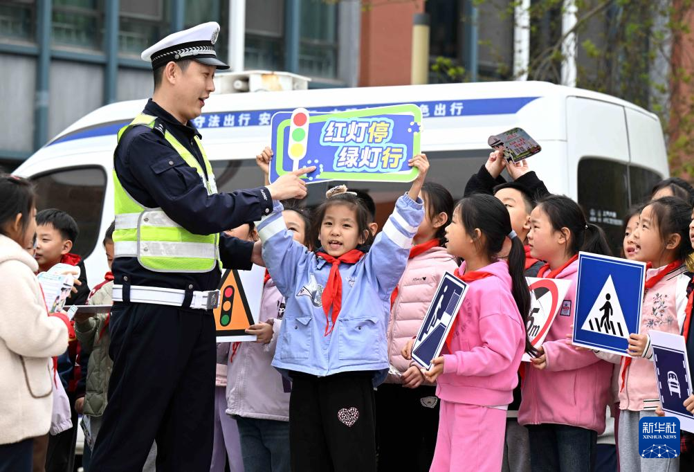 3月30日,在湖北省武汉市武昌区滨江实验第一小学,交警指导学生体验交通安全手势操。新华社发(赵军 摄)
