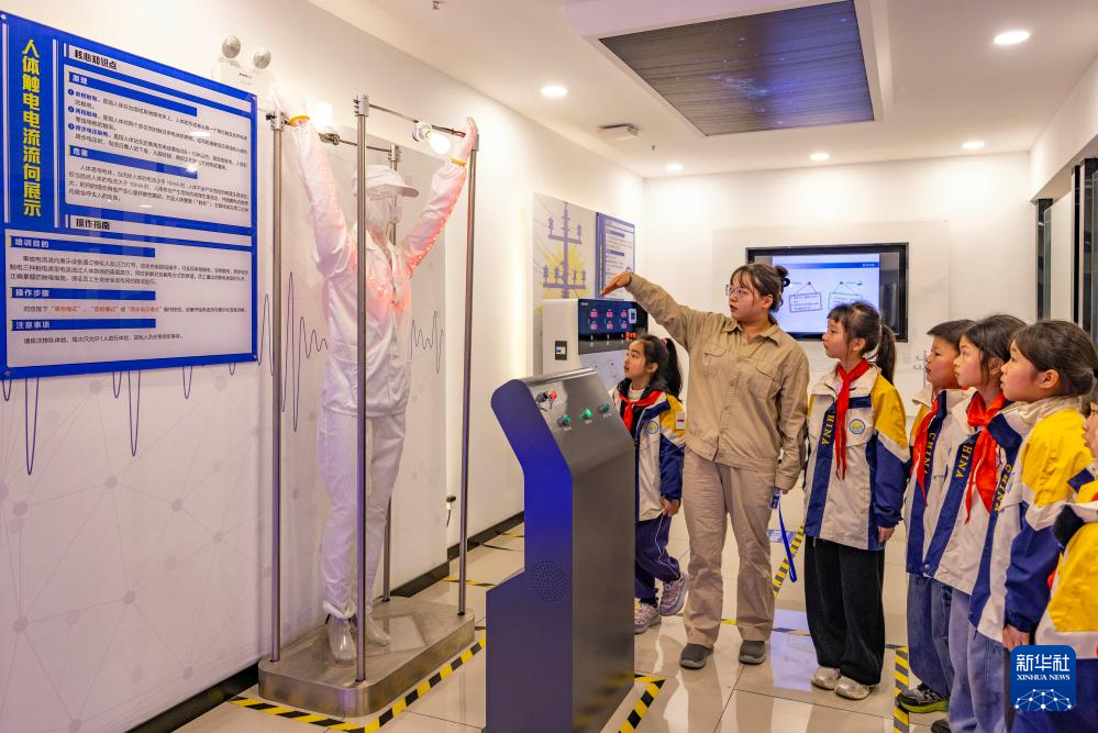 3月30日,工作人员在江苏省泰州市儿童友好实践基地通过模拟人及LED灯带显示的人体触电电流流向展示图给海陵区九龙实验学校学生讲解预防触电安全措施。新华社发(汤德宏 摄)