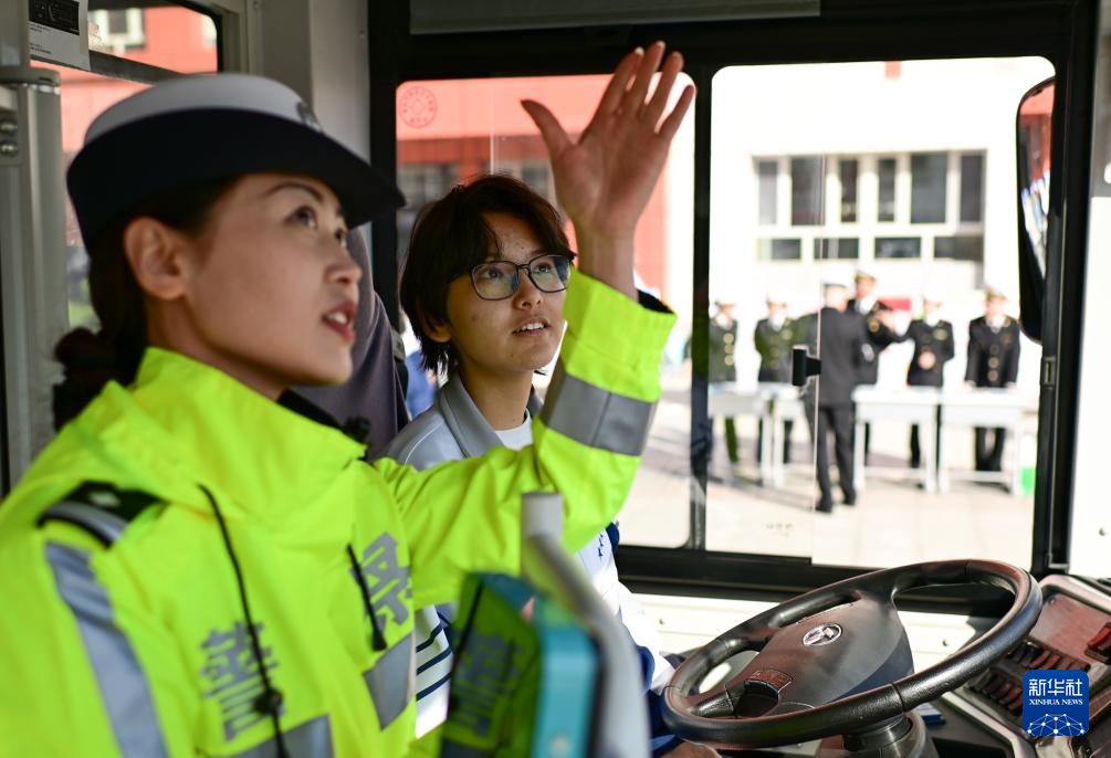 3月30日,在乌鲁木齐市第一中学(高新校区),乌鲁木齐市公安局交通管理支队民警(左)为学生讲解公交车驾驶员视线盲区。新华社发(徐锐 摄)