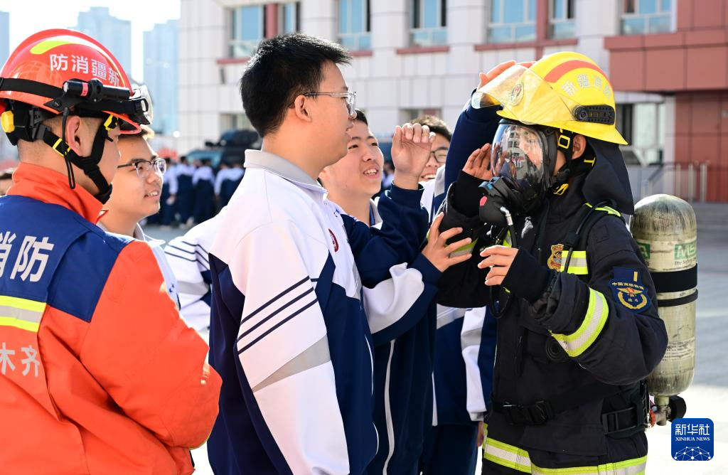 3月30日,在乌鲁木齐市第一中学(高新校区),学生在消防救援人员的指导下轮流试穿消防战斗服。新华社发(徐锐 摄)