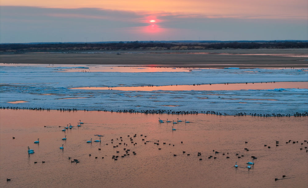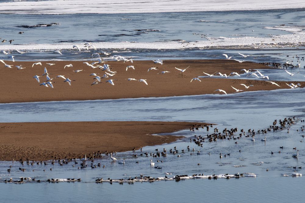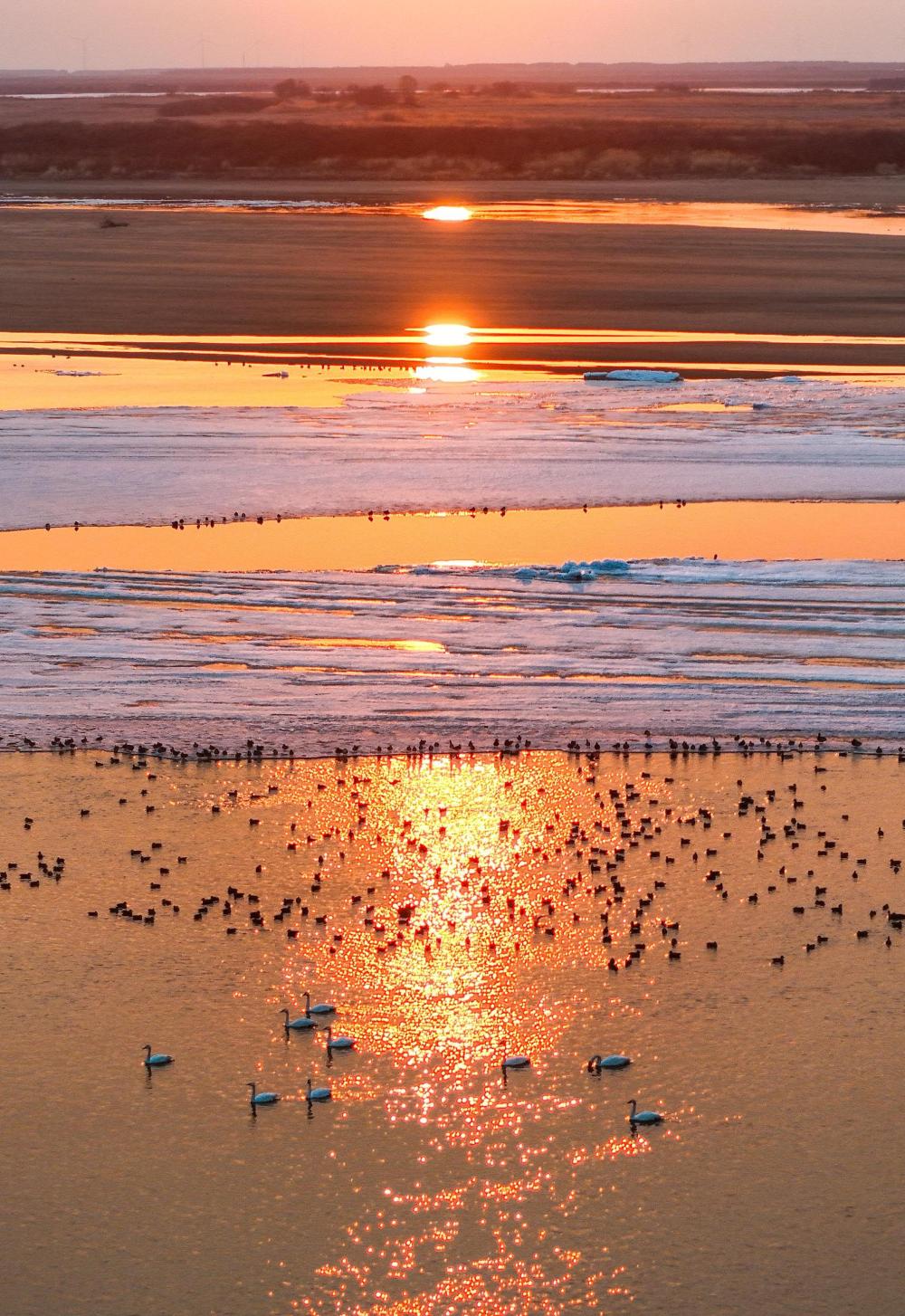 这是4月5日在松花江富锦段一处水域拍摄的候鸟(无人机照片)。新华社发(刘万平摄)