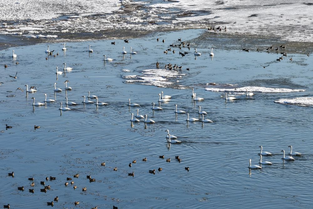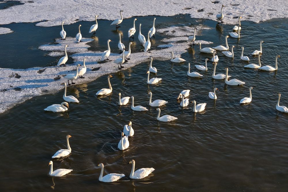 这是4月2日在松花江富锦段一处水域拍摄的天鹅(无人机照片)。新华社发(曲玉宝摄)