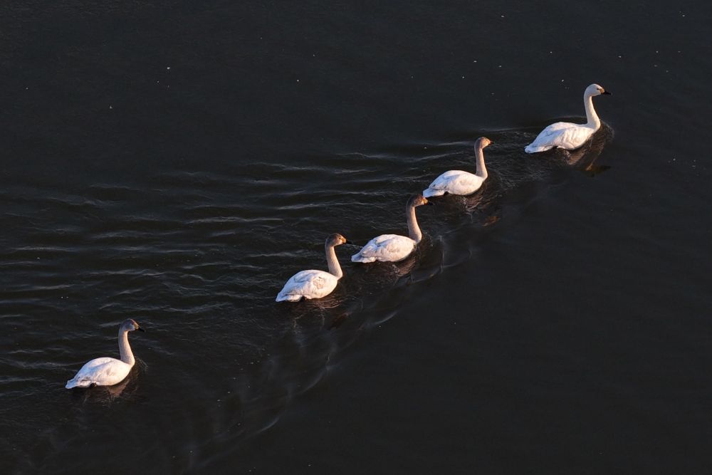 这是4月5日在松花江富锦段一处水域拍摄的天鹅(无人机照片)。新华社发(刘万平摄)