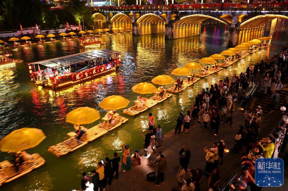 ↑ 4月4日,游客在湖北省宣恩县城贡水河畔乘坐“龙游贡水”竹筏赏景游玩。新华社发(宋文摄)