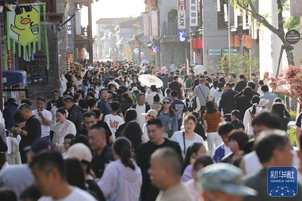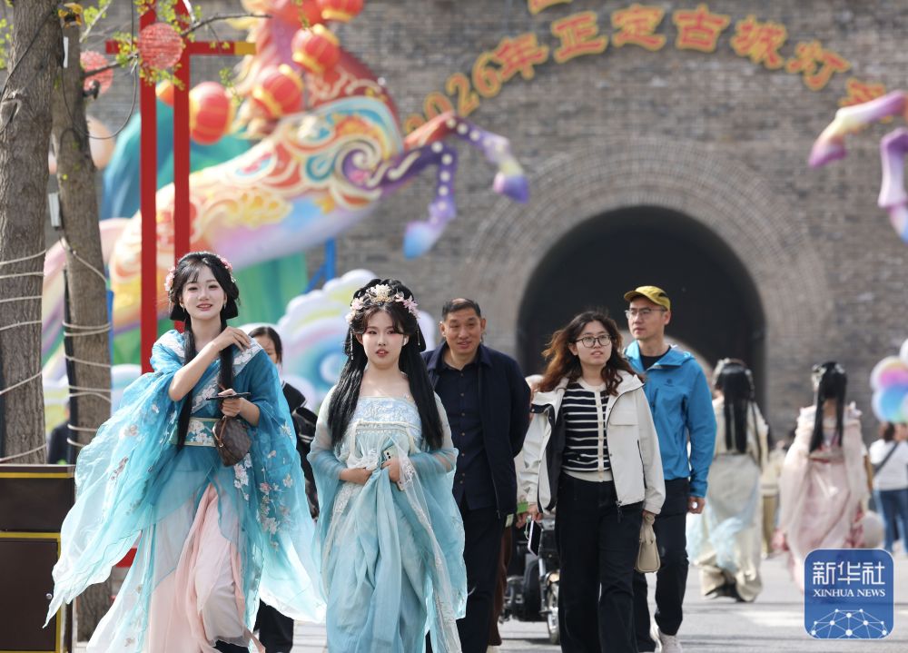 ↑ 4月5日,游客在河北省石家庄市正定古城游玩。新华社发(梁子栋摄)