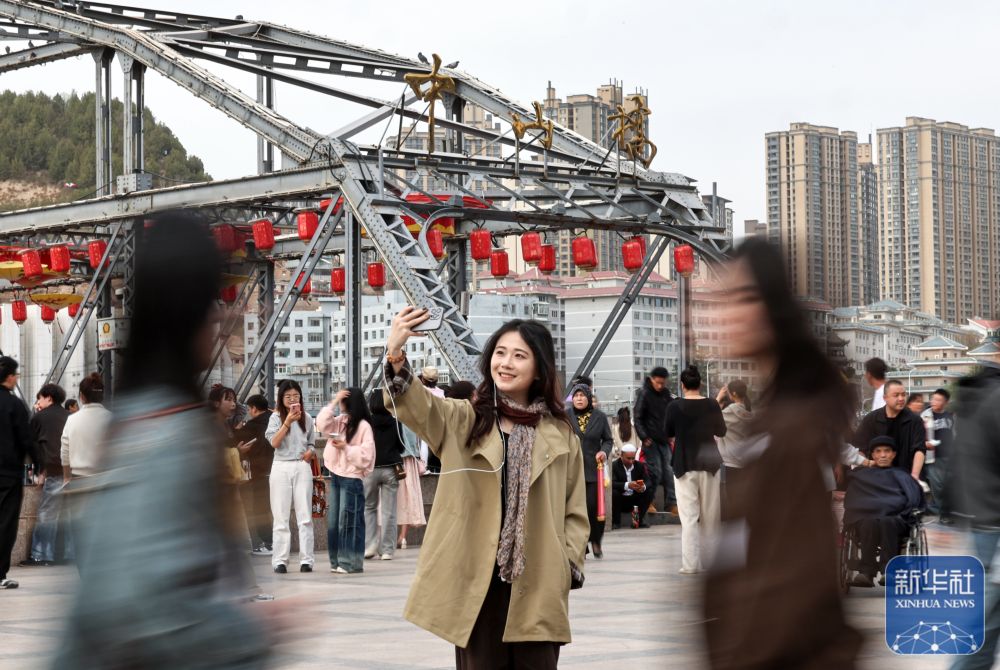↑ 4月6日,游客在甘肃省兰州市中山铁桥拍照打卡。新华社发(侯崇慧摄)