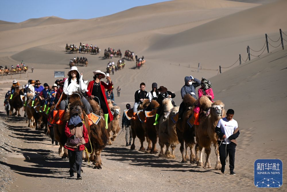 ↑ 4月5日,游客在甘肃省敦煌市鸣沙山月牙泉景区骑骆驼游览。新华社发(张晓亮摄)