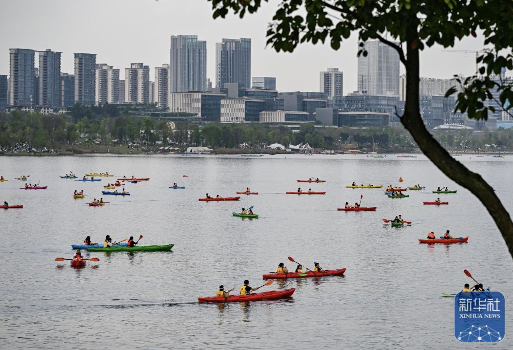 ↑ 4月4日,游客在四川天府新区兴隆湖体验皮划艇运动。新华社发(李向雨摄)