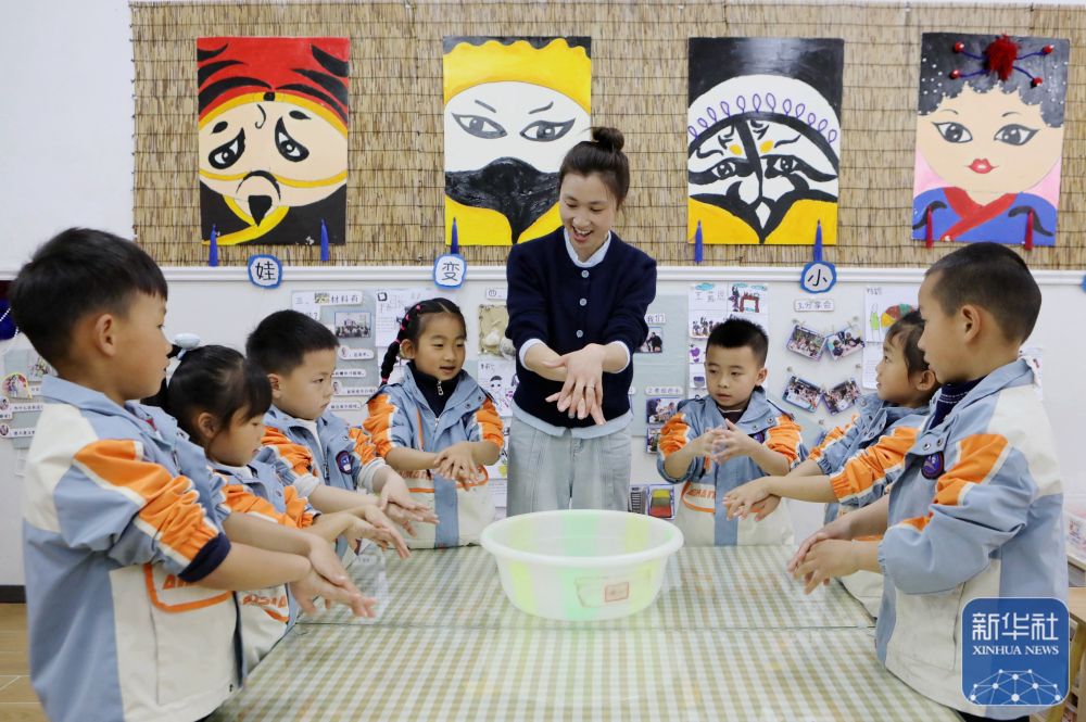 ↑ 4月7日,在贵州省黔南布依族苗族自治州罗甸县第一幼儿园,小朋友在老师的指导下学习“七步洗手法”。新华社发(史传鸿摄)