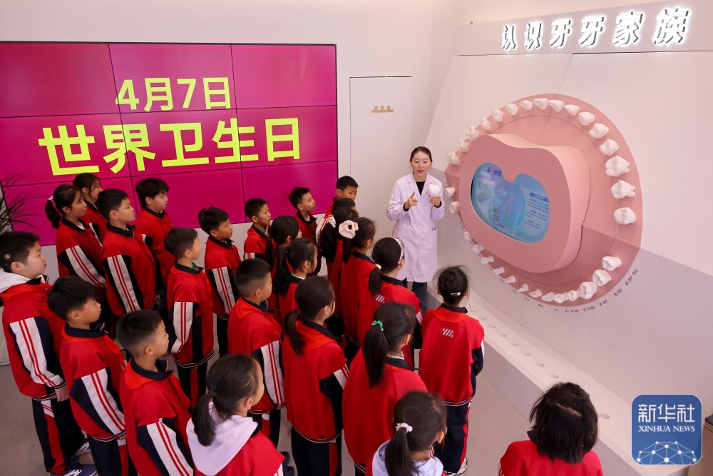 ↑ 4月7日,在山东省枣庄市口腔科普馆,医务人员为前来参观学习的小学生们普及牙齿健康知识。新华社发(孙中喆摄)