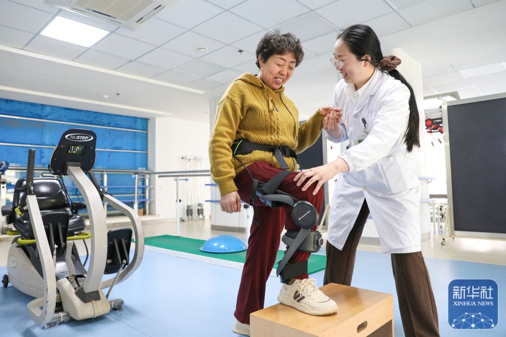 ↑ 4月7日,在江苏省海安市中医院康复训练中心,患者在治疗师指导下穿戴外骨骼机器人进行康复训练。新华社发(顾彬斌摄)