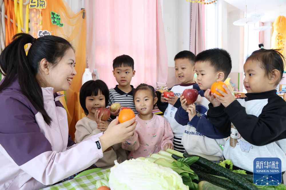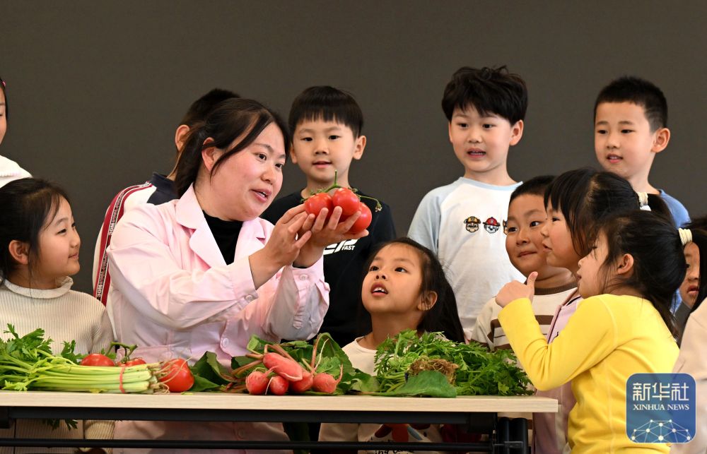 ↑ 4月7日,在河北省石家庄市新华区柏林幼儿园,校医通过趣味食育课堂引导幼儿养成健康饮食习惯。新华社发(陈其保摄)