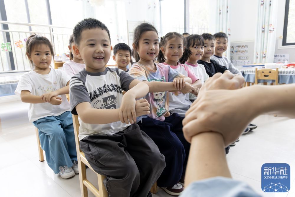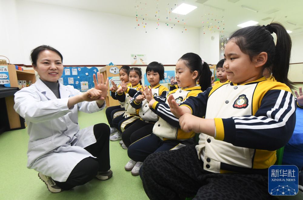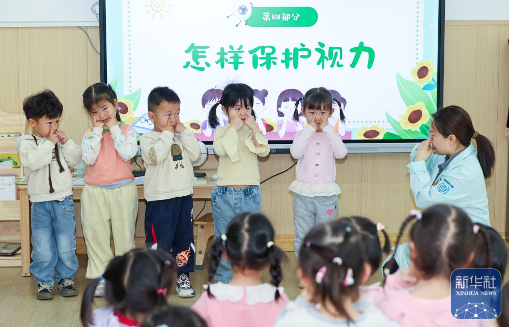 ↑ 4月7日,在河北省石家庄市华北幼儿园,小朋友在眼科医生的指导下学习眼保健操,科学保护眼睛。新华社发(梁子栋摄)