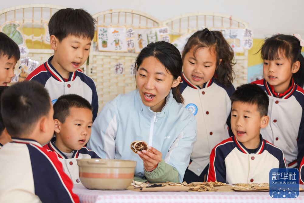 ↑ 4月7日,在山东省青岛市李沧区青峰路幼儿园,老师教小朋友认识中药材。新华社发(张鹰摄)