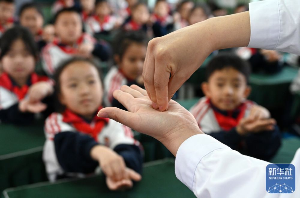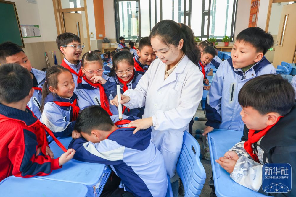↑ 4月7日,在江苏省扬州市江都区仙女小学,扬州市江都中医院医师带领小朋友体验艾灸疗法。新华社发(任飞摄)