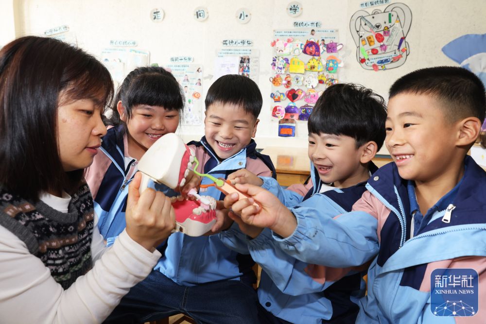↑ 4月7日,老师在贵州省黔西市第一小学指导学生正确刷牙。新华社发(范晖摄)