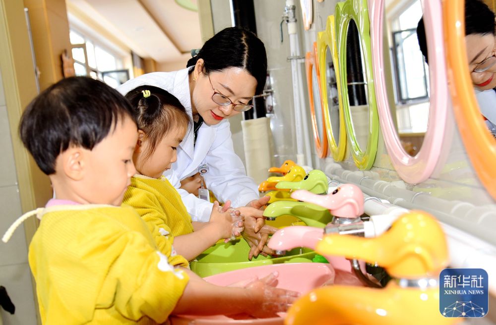 ↑ 4月7日,在甘肃省平凉市静宁县妇幼保健院托育园,医务人员指导孩子们用“七步洗手法”洗手。新华社发(王毅摄)