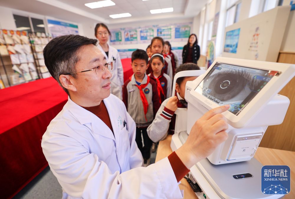 ↑ 4月7日,在山东省荣成市实验小学近视预防智慧平台,眼科医护人员使用电脑验光仪为学生开展专业视力检测。新华社发(李信君摄)