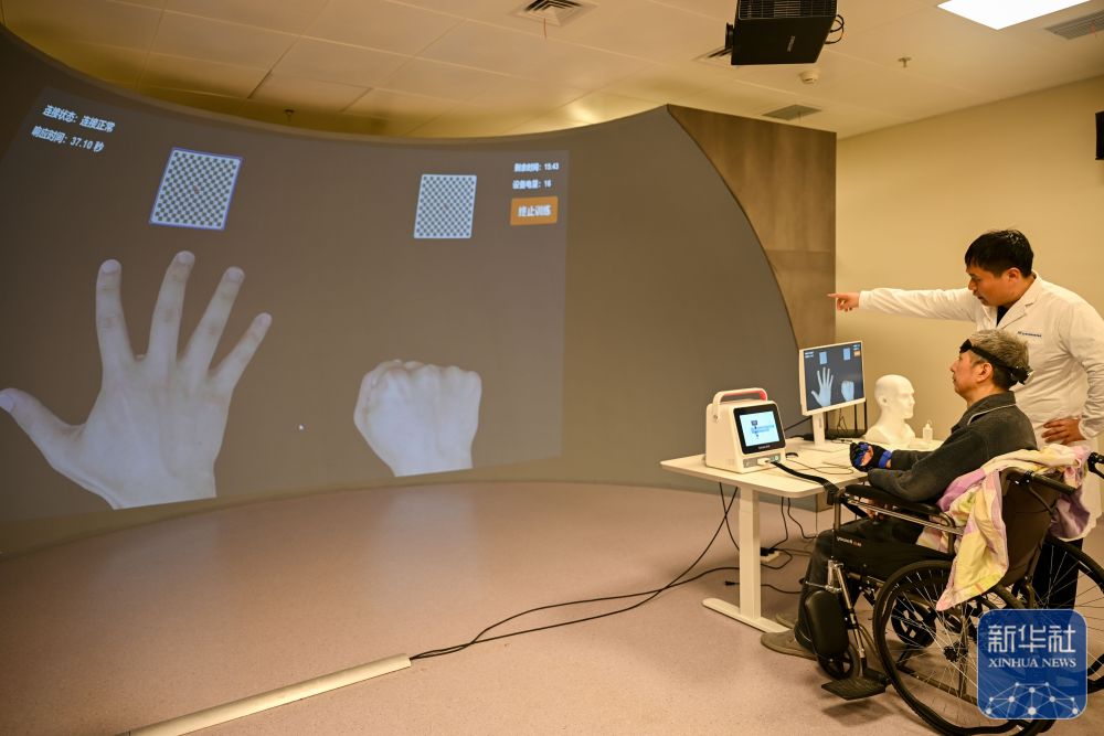 ↑ 4月7日,在贵州省贵阳市北京积水潭医院贵州医院,医生在指导患者进行脑机接口康复训练。新华社发(袁福洪摄)