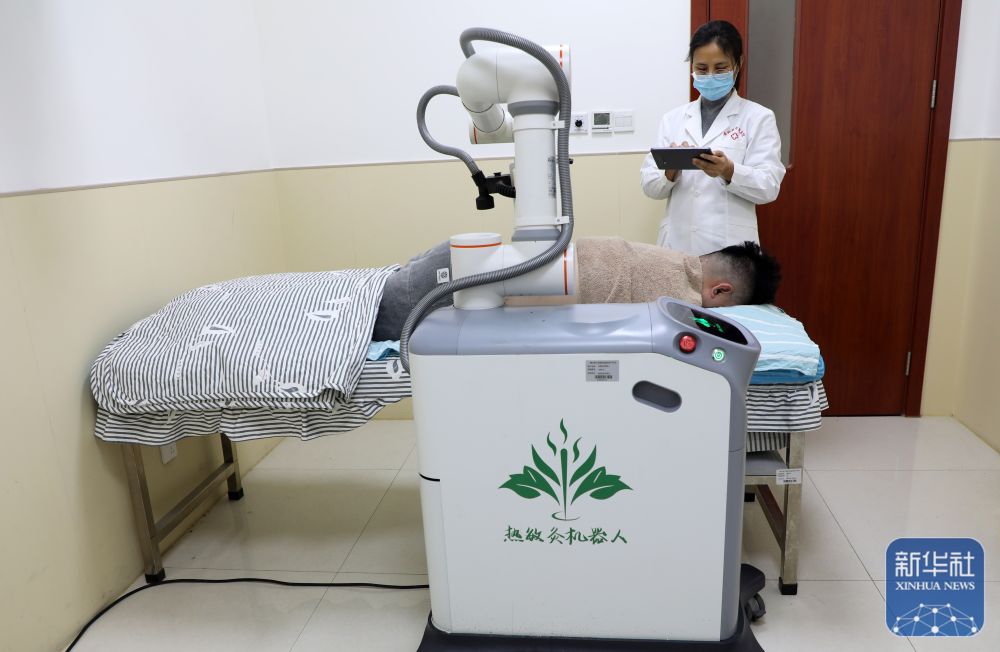↑ 4月7日,在山东省滨州市博兴县中医医院灸疗室,医护人员用热敏灸机器人为患者进行艾灸治疗。新华社发(陈彬摄)