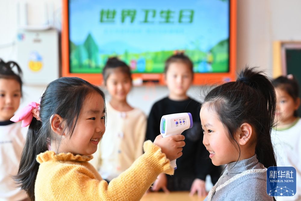 ↑ 4月7日,在山东省滕州市西岗镇中心幼儿园,小朋友体验测量体温。新华社发(李志军摄)