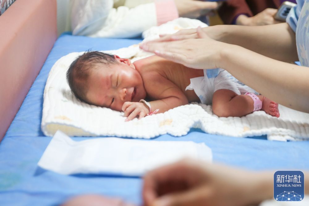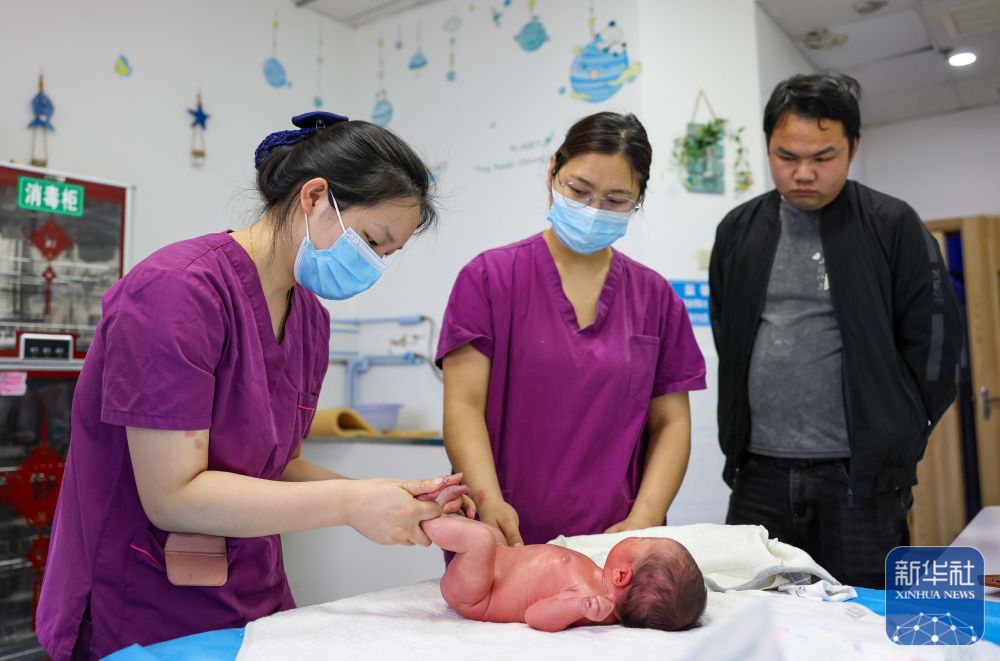 ↑ 4月7日,在贵州省铜仁市玉屏侗族自治县人民医院产科,医护人员为新生儿家属传授按摩技术。新华社发(胡攀学摄)