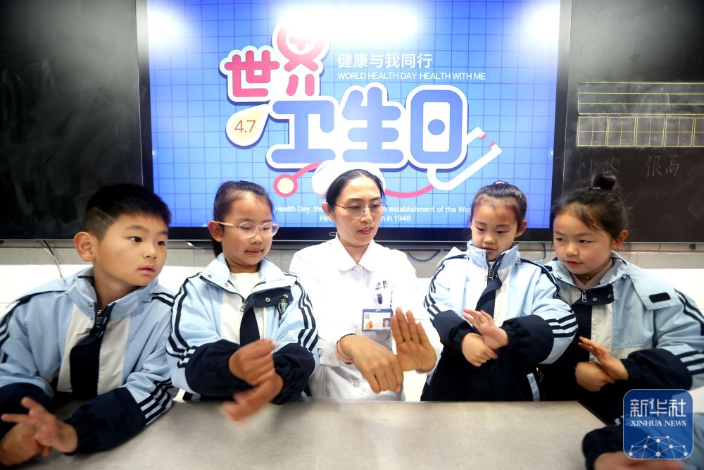 ↑ 4月7日,在江苏省连云港市院前小学,医务人员给学生讲解“七步洗手法”。新华社发(王春摄)