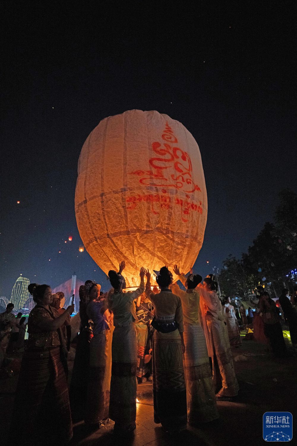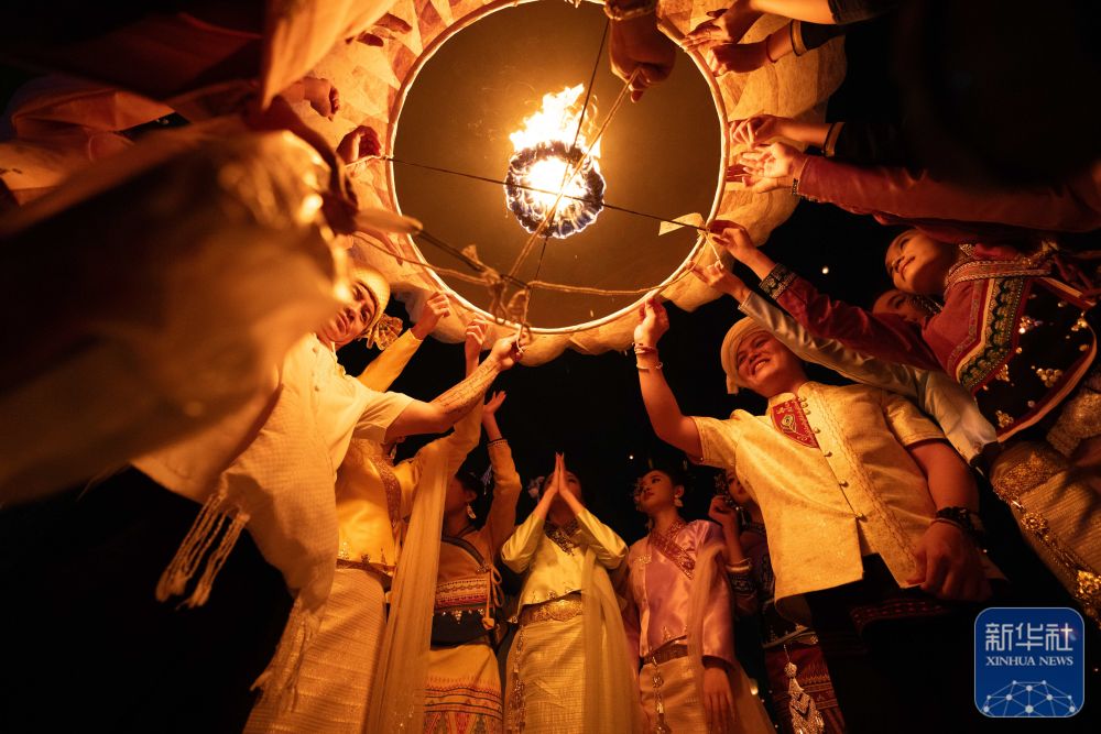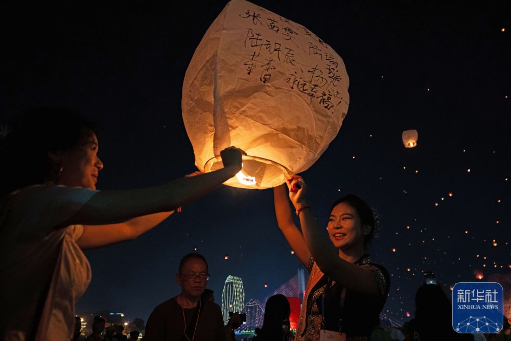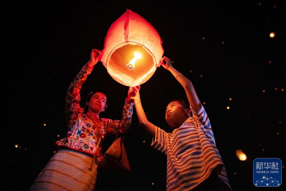 4月13日晚,云南省西双版纳傣族自治州景洪市澜沧江畔,来自五湖四海的游客和当地群众一起,将一盏盏写满祝福的孔明灯放飞,空中灯火如星河倒悬,与江面波光交相辉映。