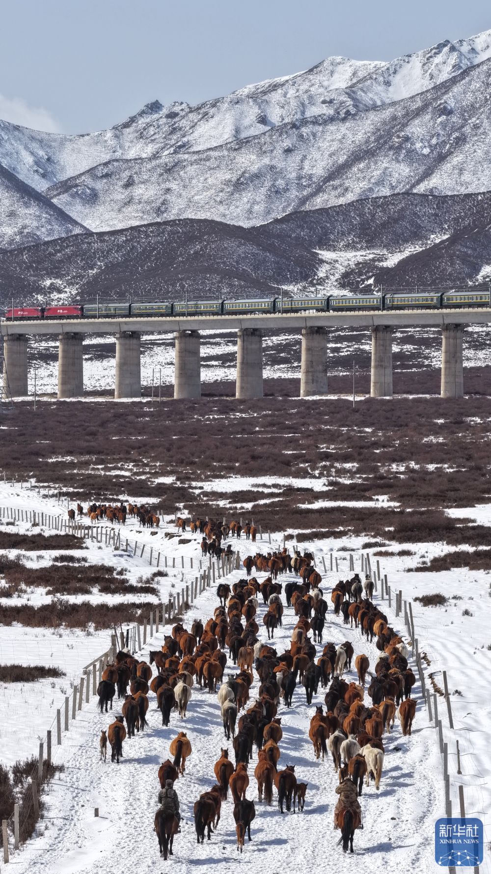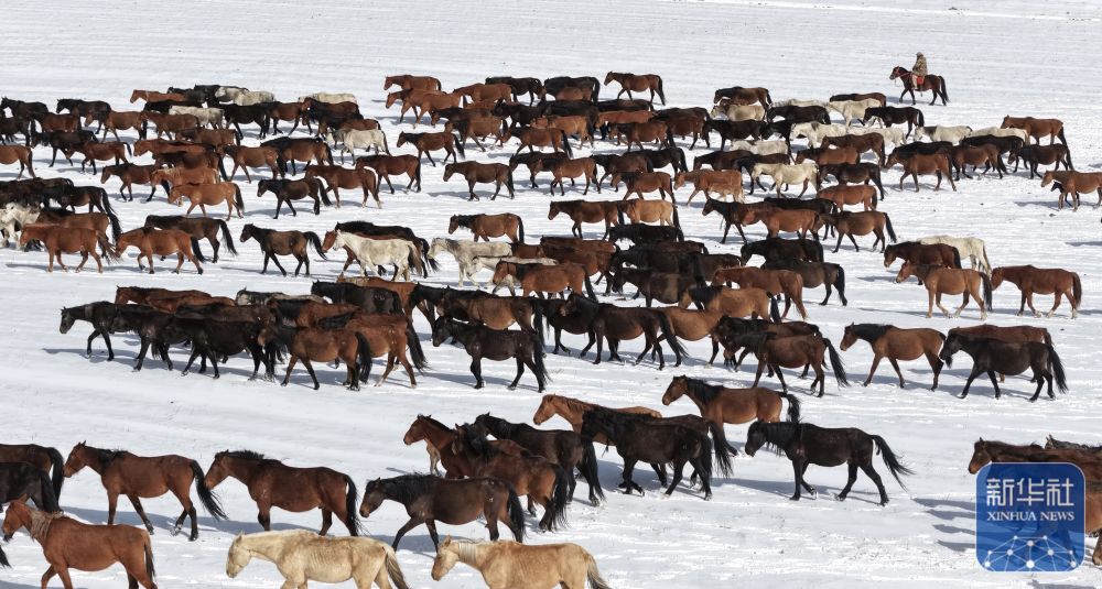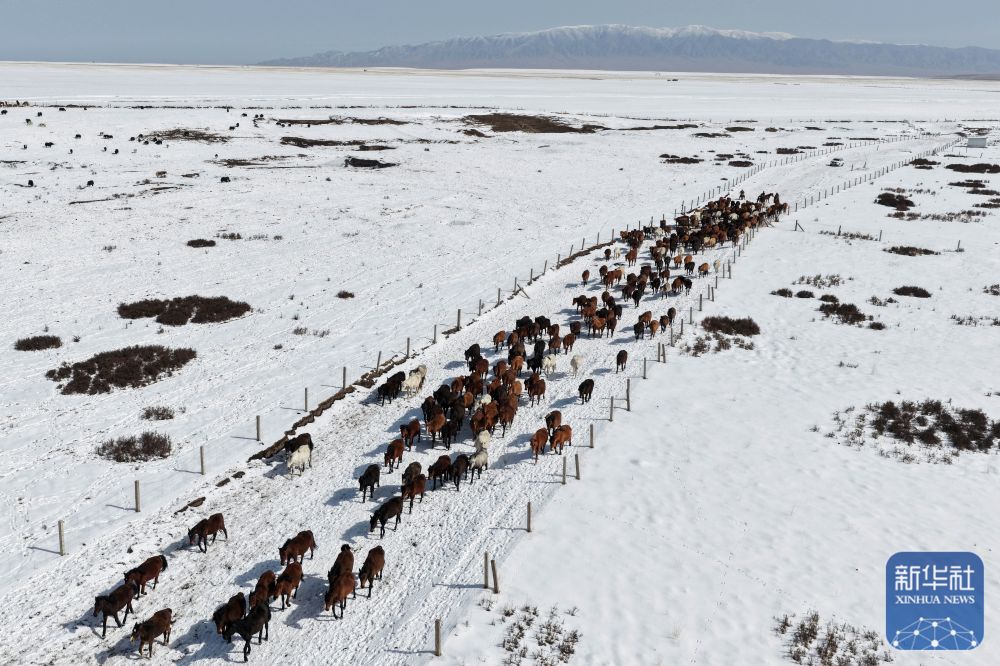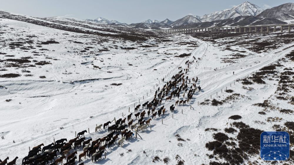 ↑ 4月14日拍摄的山丹马场的转场马群(无人机照片)。