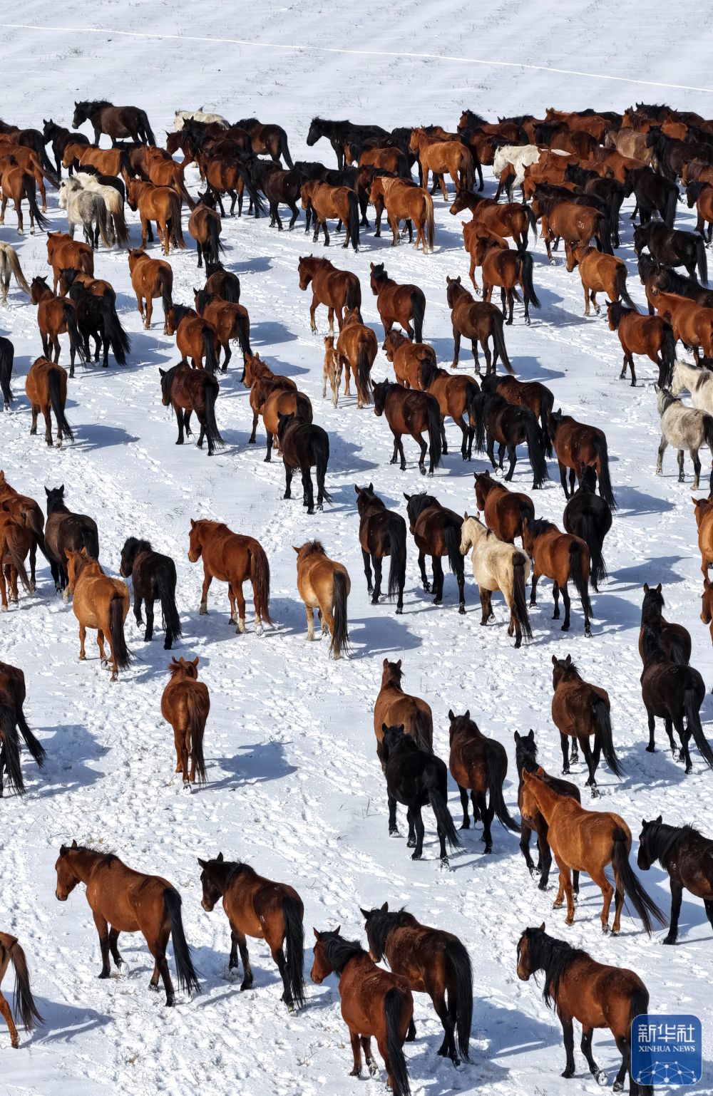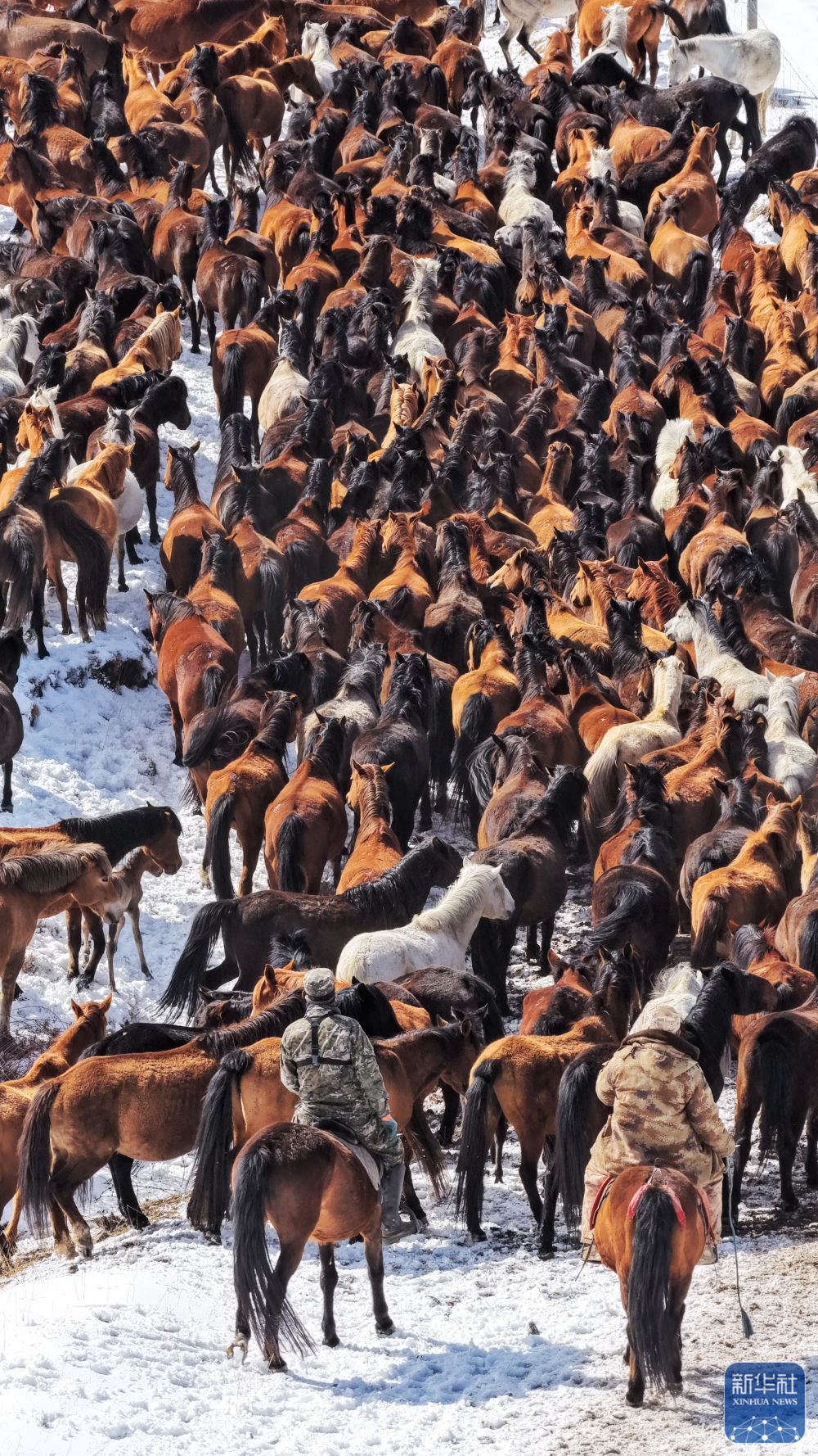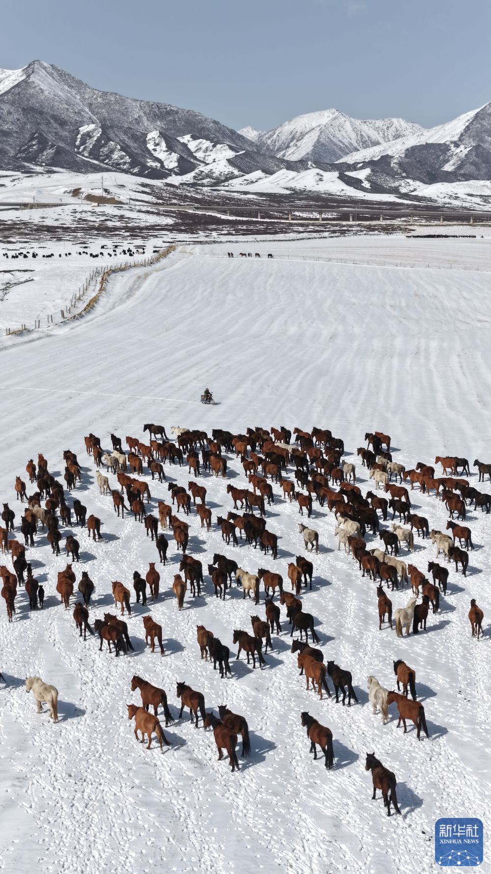 ↑ 4月14日,山丹马场的牧马人组织马群转场(无人机照片)。