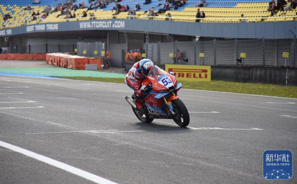 ↑ 在荷兰阿森,车手驾驶“张雪机车”参加超级杆位赛。
