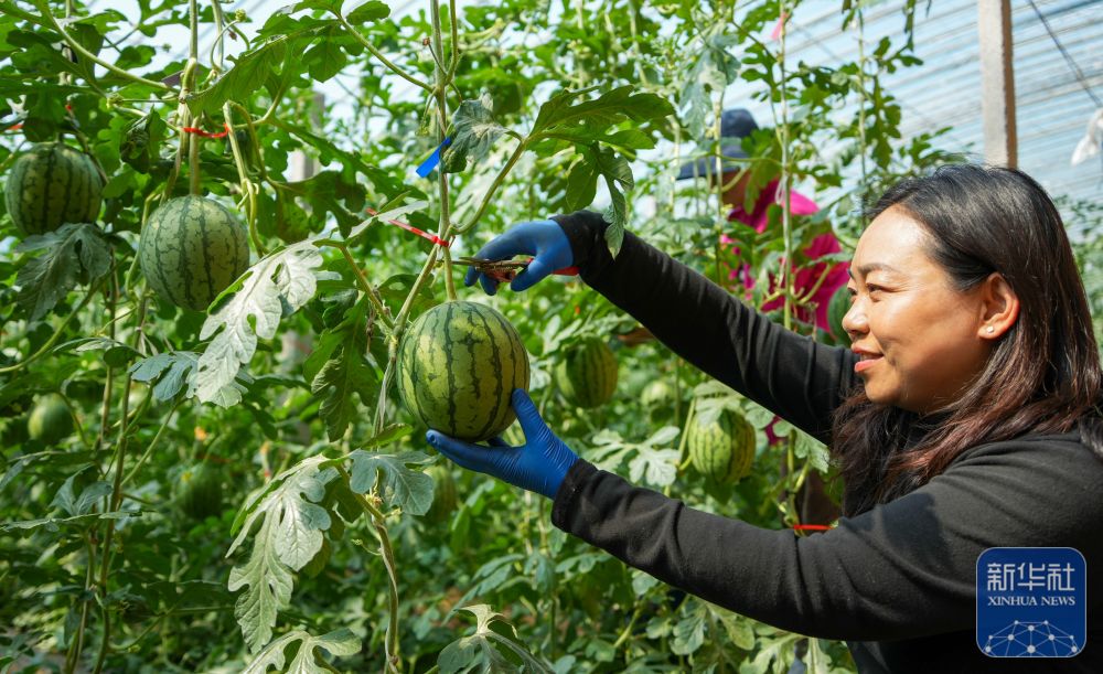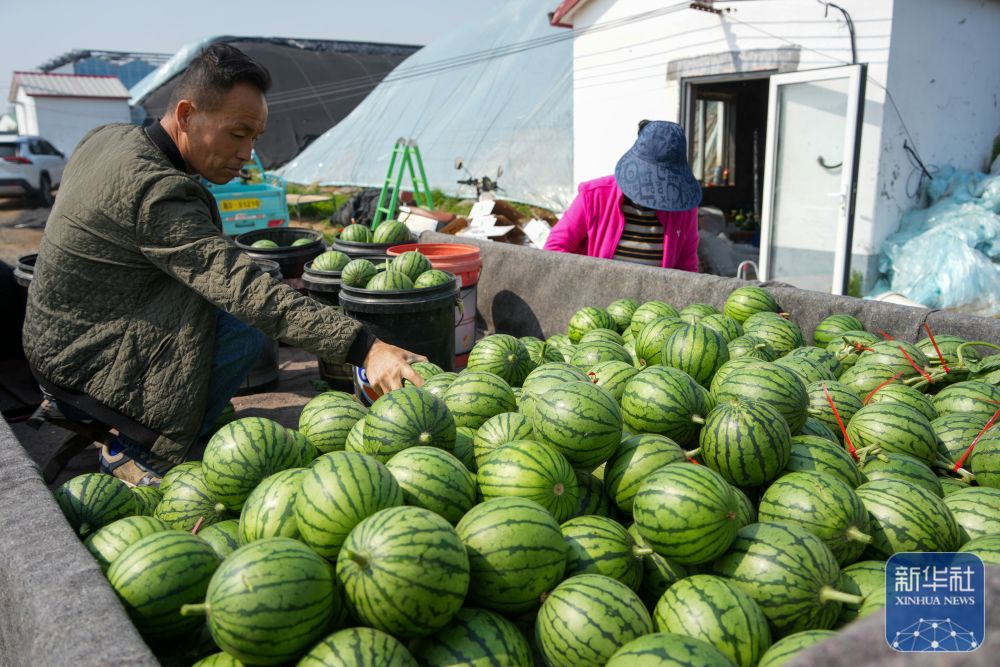 ↑ 4月17日,在潍坊市昌乐县五图街道,瓜农在收获成熟的小型西瓜。