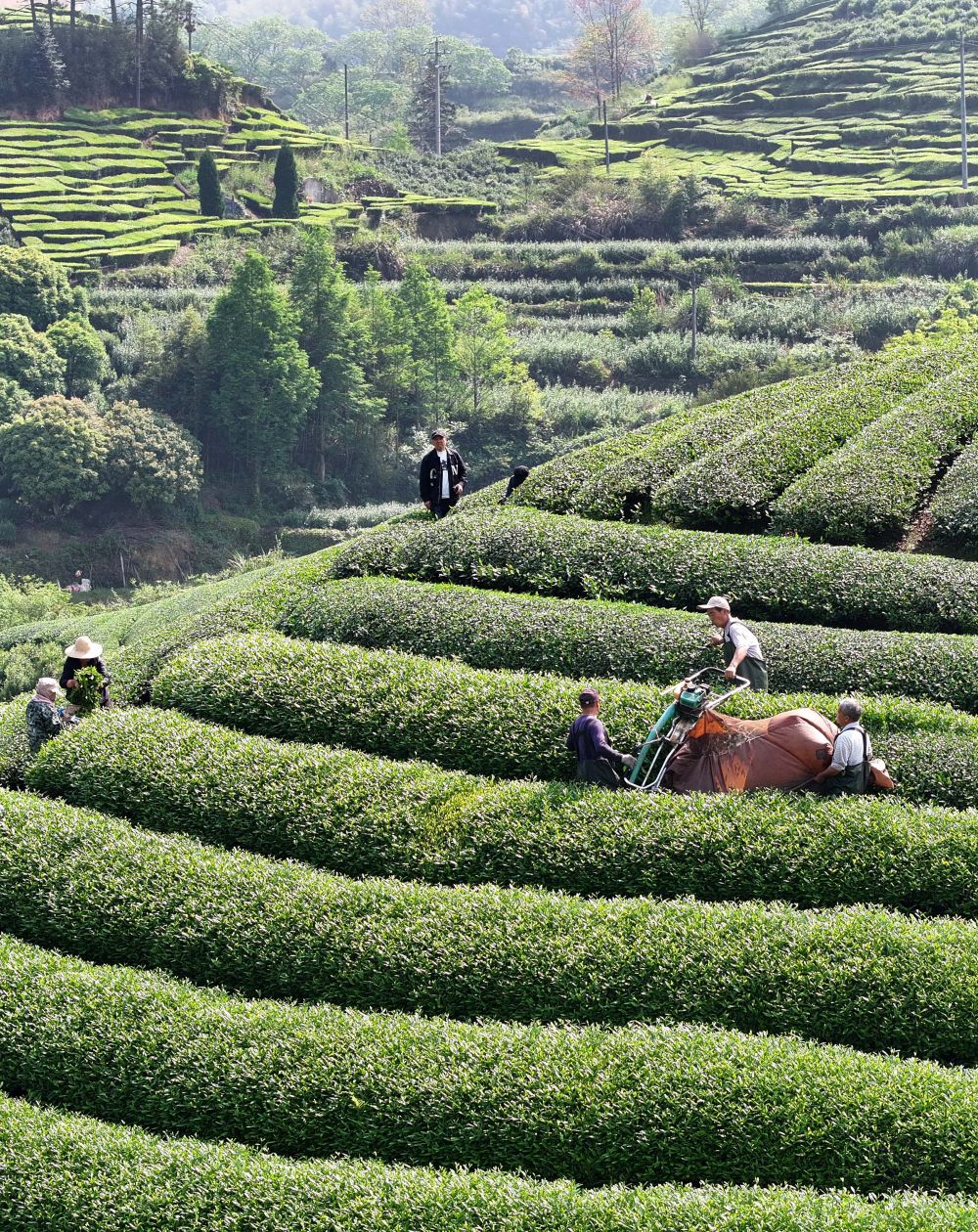 ↑ 4月19日,茶农用采茶机在浙江省金华市武义县白姆乡水阁村采摘春茶(无人机照片)。新华社发(张建成摄)