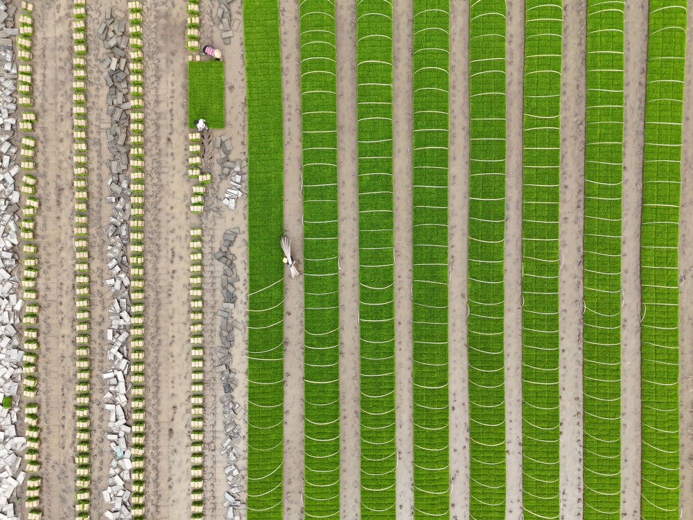 ↑ 4月19日,农民在浙江省乐清市城东街道集中育秧秧田起秧苗(无人机照片)。新华社发(蔡宽元摄)