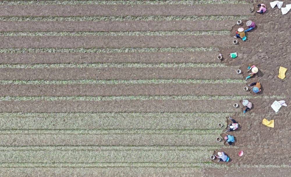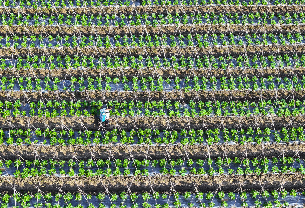 ↑ 4月19日,湖南省常宁市宜阳街道万寿村农民在管护蔬菜(无人机照片)。新华社发(周秀鱼春摄)