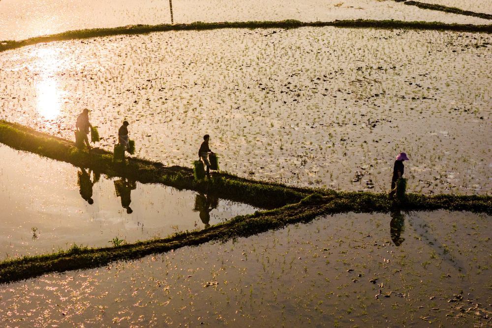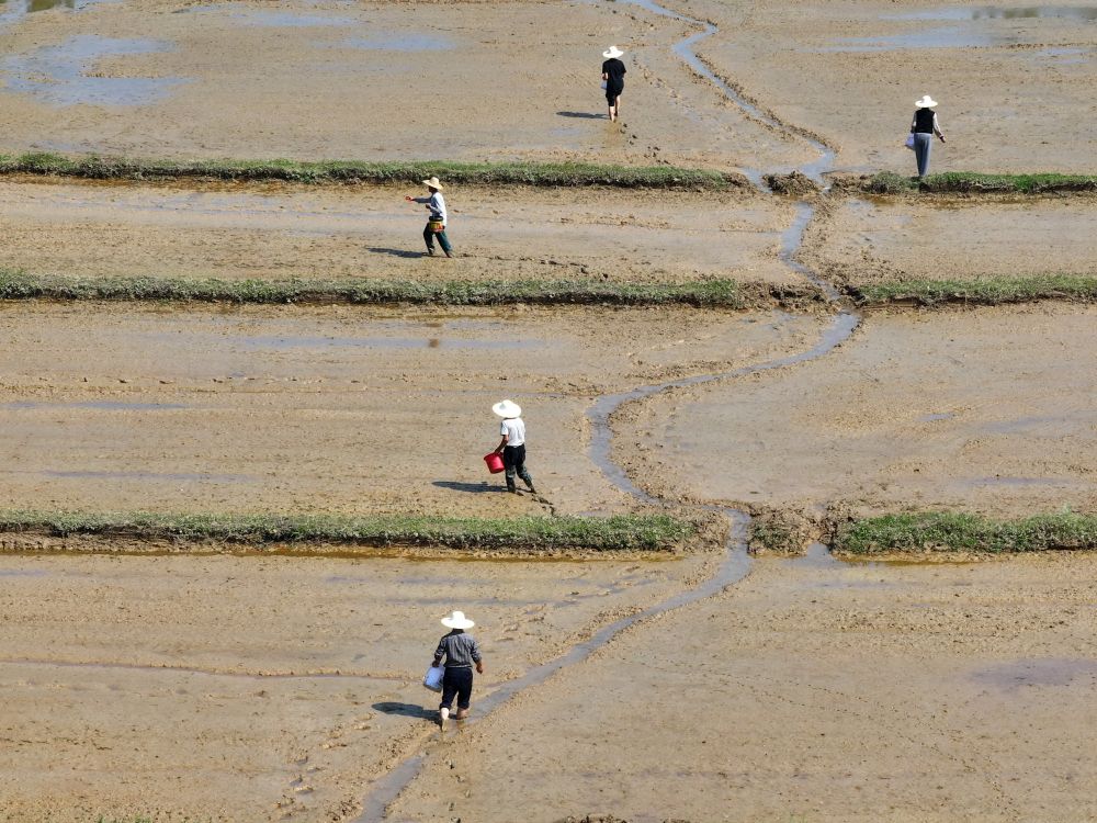 ↑ 4月19日,在湖南省娄底市双峰县井字镇蒋市村,农民拎着秧苗前往大田准备抛秧(无人机照片)。新华社发(李建新摄)