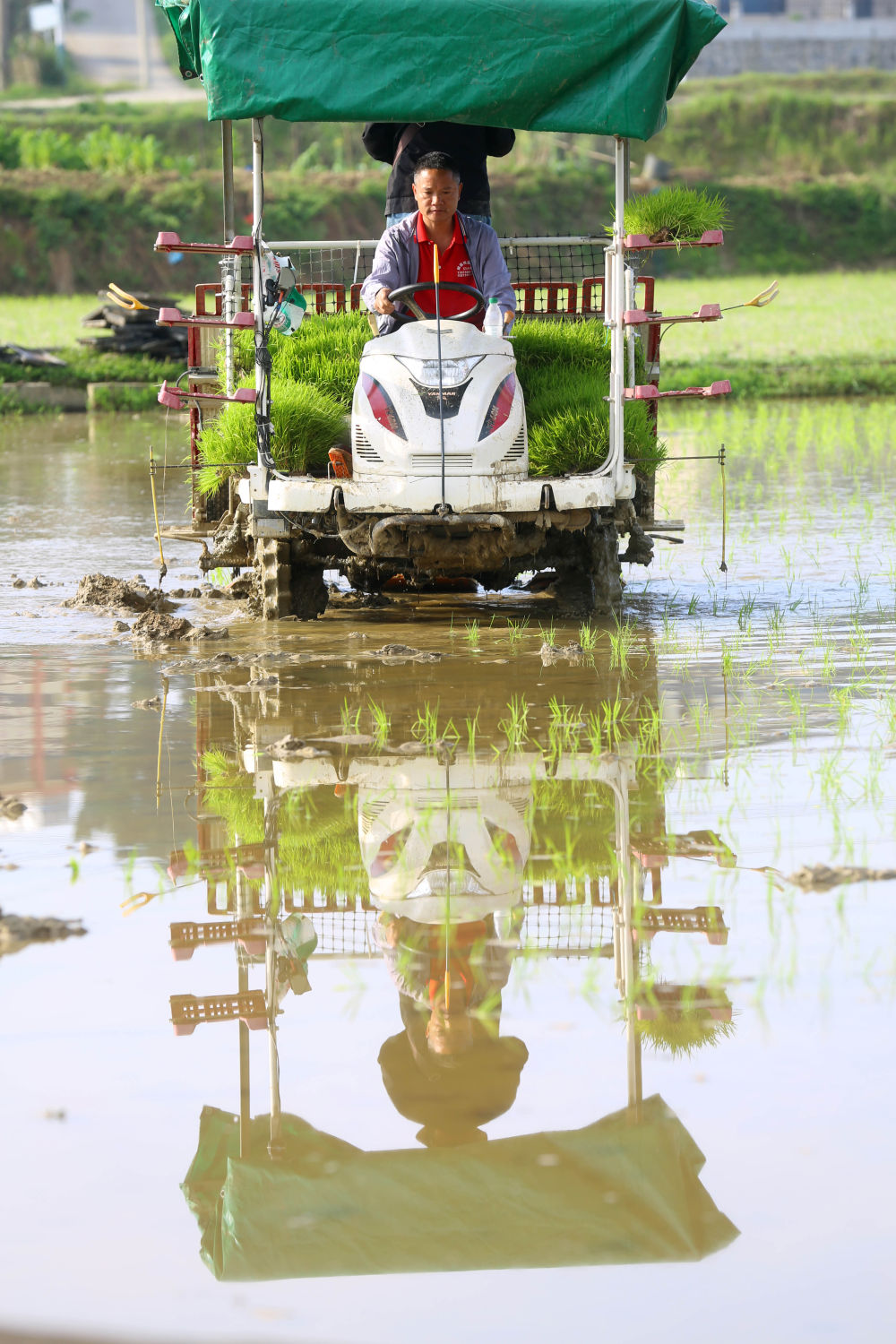 ↑ 4月19日,湖南省邵阳市隆回县三阁司镇龙洲村,农机手驾驶插秧机插早稻。新华社发(曾勇摄)