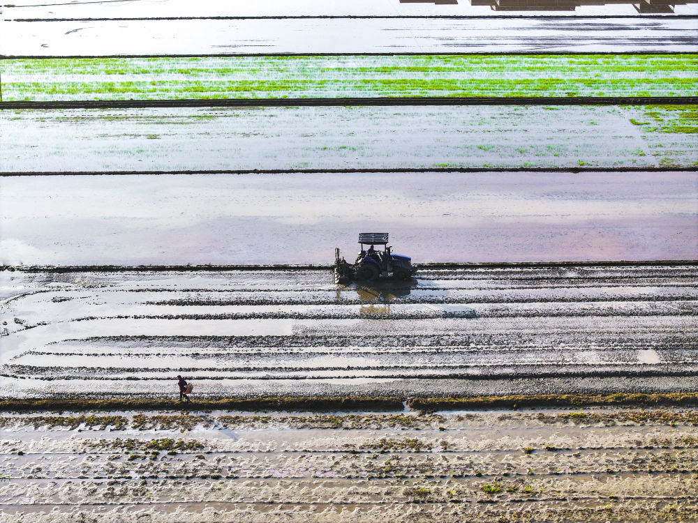 ↑ 4月19日,湖南省常宁市宜阳街道万寿村农民驾驶农机在翻耕农田(无人机照片)。新华社发(周秀鱼春摄)
